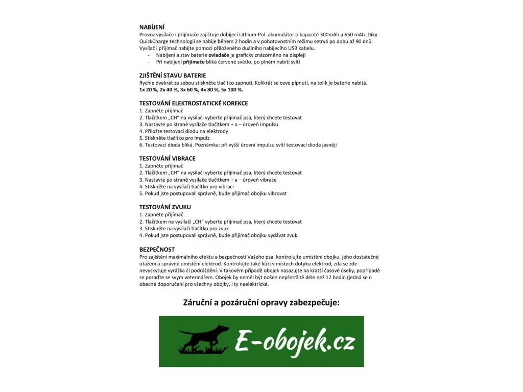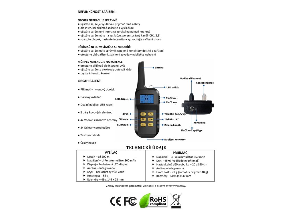| Funkce: | Zvukový signál, vibrace, elektrický šok, světlo, vodotěsný přijímač, protištěkací funkce |