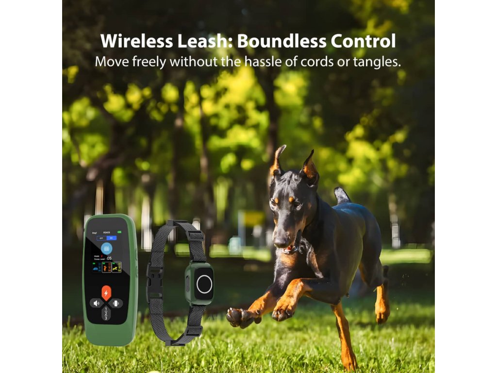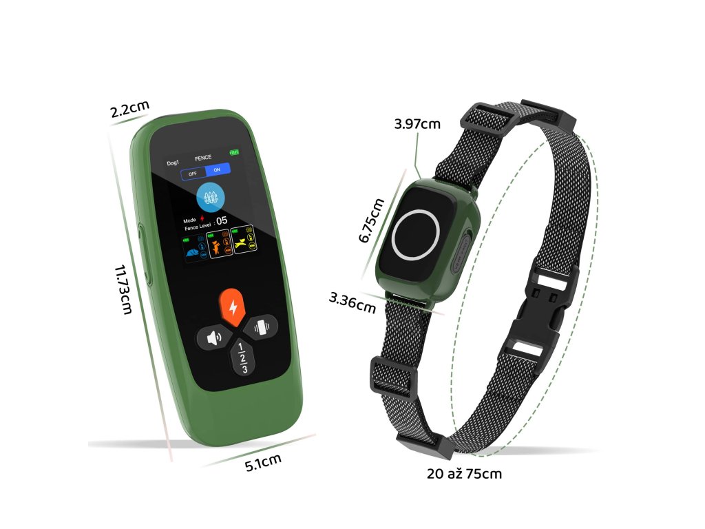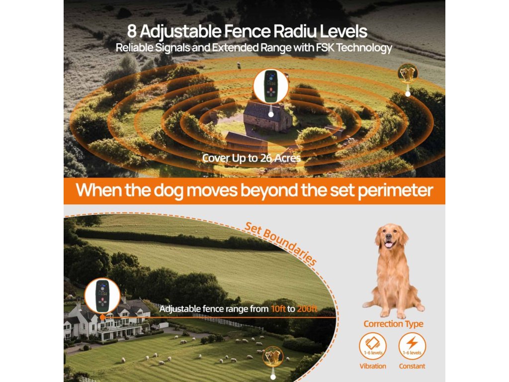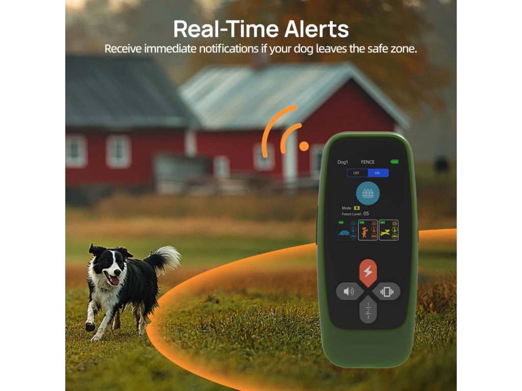 Pomocí bezdrátového ohradníku snadno vytvoříte bezpečnou zónu pro pohyb psa. Poloměr lze nastavit v rozmezí 3–60 metrů v 8 úrovních. Jakmile pes překročí nastavenou hranici, obojek jej nejprve upozorní a následně automaticky zvyšuje intenzitu korekce.